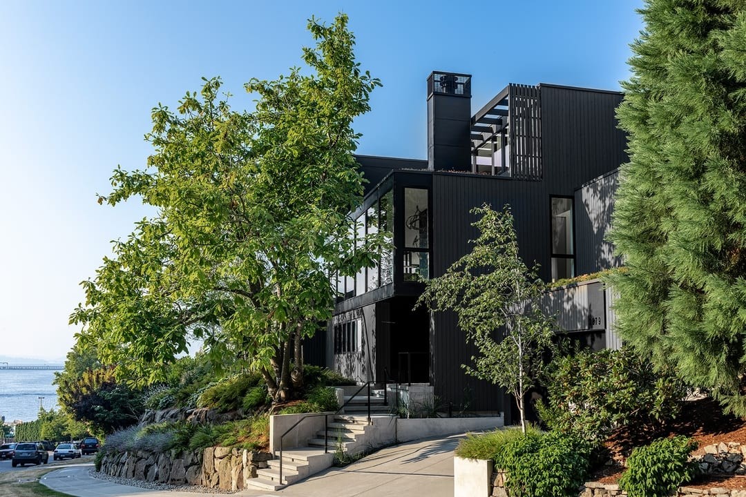 Outro objetivo da equipa era criar espaços mais abertos nesta casa, três andares e quatro quartos, com interiores de Kathleen Glossa, fundadora da Swivel Interiors. Janelas do chão ao teto e três conjuntos de portas duplas levam ao terraço do andar principal, abrindo para vistas excecionais das árvores, do lago e do Monte Rainier. De facto, a combinação de vidro e caixas sólidas que caracteriza a casa permite ligações entre o interior e o exterior.